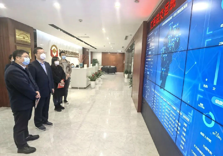 童詠雷一行首先觀摩了公司輔助監(jiān)管信息展示大屏,詳細(xì)了解了公司輔助地方金融監(jiān)管部門建設(shè)運營的“贛金鷹眼”、“贛金衛(wèi)士”等信息化監(jiān)管平臺的管理運行情況和創(chuàng)新做法,并給與高度肯定。
