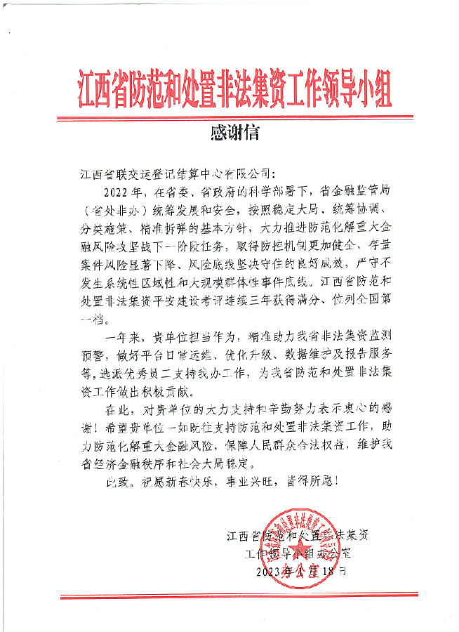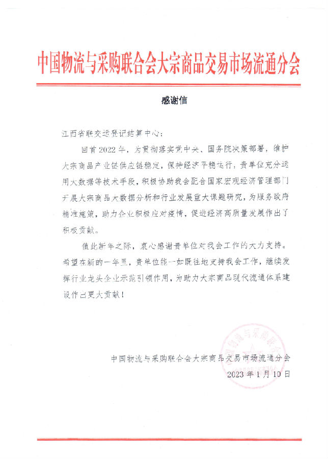 新春佳節(jié)來臨之際,江西聯(lián)交運連續(xù)收獲兩封來自江西省防范和處置非法集資工作領(lǐng)導(dǎo)小組辦公室和中國物流與采購聯(lián)合會大宗商品交易市場流通分會的《感謝信》,分別對公司長期以來助力我省防范和處置非法集資工作,保障地方金融穩(wěn)定以及協(xié)助維護大宗商品產(chǎn)業(yè)鏈供應(yīng)鏈穩(wěn)定,促進實體經(jīng)濟高質(zhì)量發(fā)展等方面作出的積極貢獻表達肯定和真誠感謝。