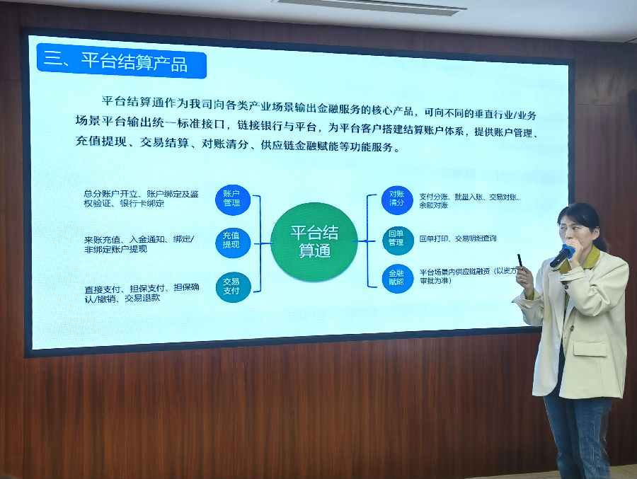 之后,市場(chǎng)總監(jiān)熊保明對(duì)平臺(tái)結(jié)算通產(chǎn)品進(jìn)行了詳細(xì)介紹。他介紹到,平臺(tái)結(jié)算通產(chǎn)品可為相關(guān)產(chǎn)業(yè)平臺(tái)和供應(yīng)鏈核心企業(yè)/平臺(tái)提供基于第三方的統(tǒng)一賬戶管理和結(jié)算體系,滿足多類線上產(chǎn)業(yè)平臺(tái)的資金存管、實(shí)時(shí)結(jié)算、賬戶管理等共性需求。目前公司已對(duì)接上線和正在對(duì)接多家重點(diǎn)產(chǎn)業(yè)平臺(tái),下一步將重點(diǎn)向我省“2+6+N”重點(diǎn)產(chǎn)業(yè)群推廣應(yīng)用。最后,綜合管理部技術(shù)主管徐波從技術(shù)角度出發(fā),對(duì)平臺(tái)結(jié)算通產(chǎn)品開發(fā)管理思路等進(jìn)行了介紹,并表示將持續(xù)做好技術(shù)保障工作,為公司“結(jié)算+科技”發(fā)展貢獻(xiàn)更多技術(shù)力量。