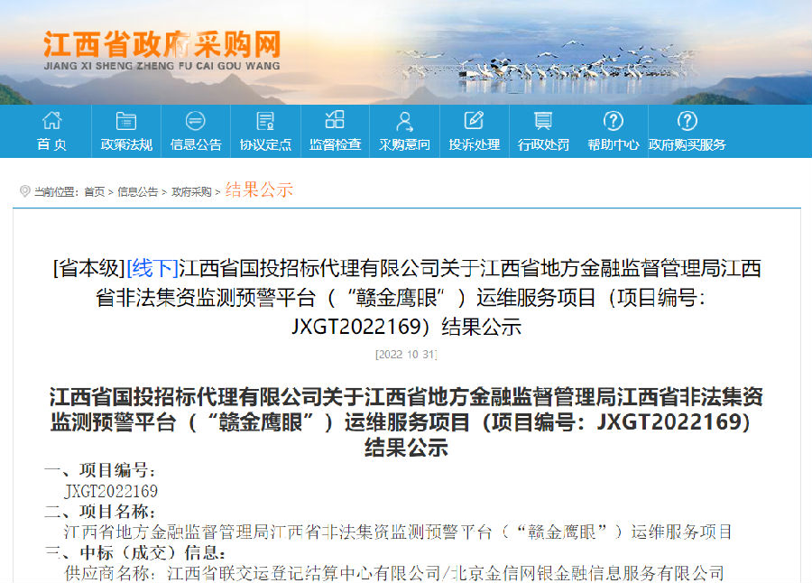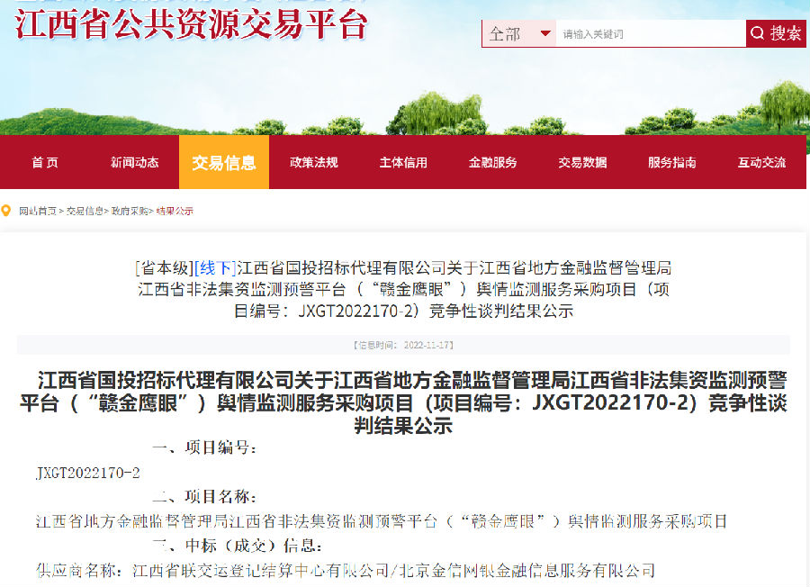 繼連續(xù)兩年中標(biāo)江西省非法集資監(jiān)測(cè)預(yù)警平臺(tái)(“贛金鷹眼”)運(yùn)維服務(wù)項(xiàng)目后,近日,江西聯(lián)交運(yùn)又中標(biāo)江西省非法集資監(jiān)測(cè)預(yù)警平臺(tái)(“贛金鷹眼”)輿情監(jiān)測(cè)服務(wù)項(xiàng)目。