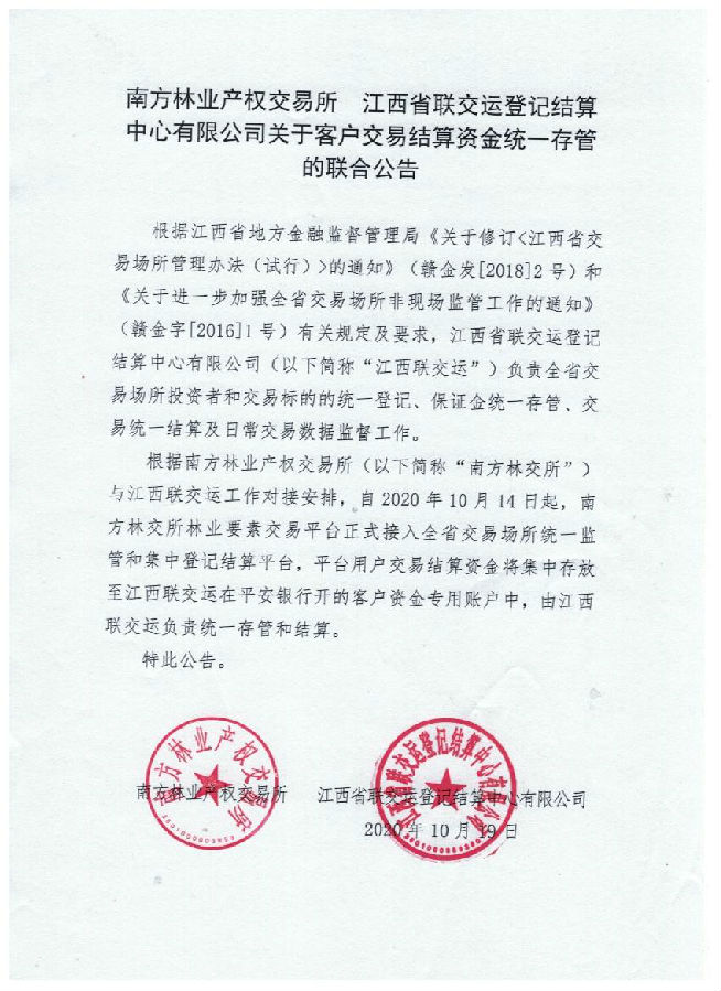 根據(jù)江西省林業(yè)經(jīng)濟(jì)發(fā)展中心(南方林業(yè)產(chǎn)權(quán)交易所)與江西省聯(lián)交運(yùn)登記結(jié)算中心有限公司(以下簡稱“江西聯(lián)交運(yùn)”)工作對接安排,自2023年4月19日起,江西省林業(yè)經(jīng)濟(jì)發(fā)展中心(南方林業(yè)產(chǎn)權(quán)交易所)贛林碳抵消平臺對接江西聯(lián)交運(yùn)“平臺結(jié)算通”系統(tǒng)正式上線,平臺用戶交易結(jié)算資金將集中存放至江西聯(lián)交運(yùn)在華夏銀行開設(shè)的客戶資金專用賬戶中,由江西聯(lián)交運(yùn)負(fù)責(zé)統(tǒng)一存管和結(jié)算。